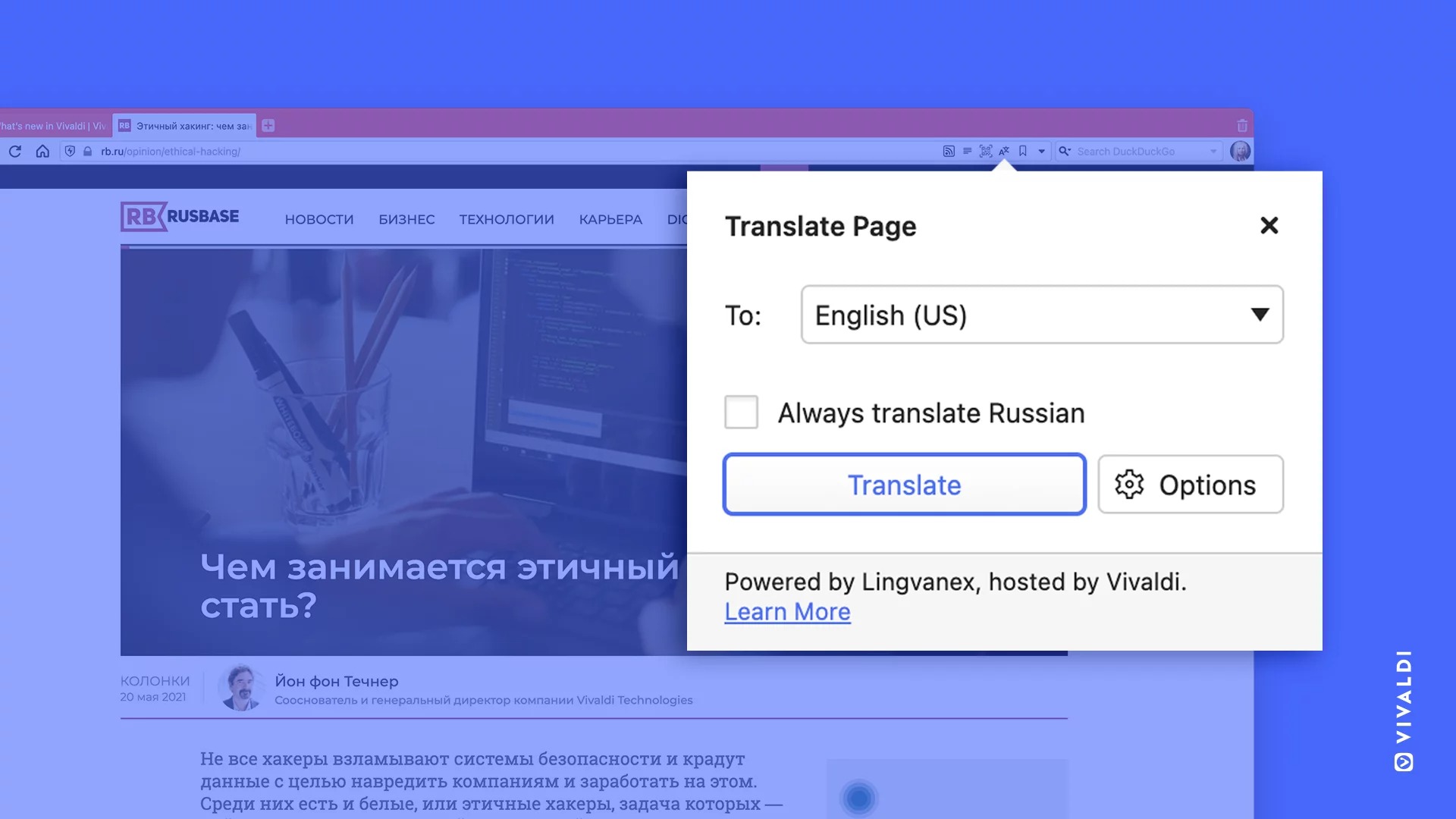 Tout d’abord, le navigateur est désormais doté de Vivaldi Translate, un moteur de traduction intégré alimenté par Lingvanex qui est préchargé avec le navigateur. Également disponible sur Android et les Chromebooks, la fonction de traduction présente un avantage majeur : elle fonctionne sur les serveurs de Vivaldi en Islande, de sorte que les données ne sont pas téléchargées vers des tiers pour exécuter la traduction. Vivaldi affirme qu’il s’agit d’une alternative à Google Traduction ou Bing Traducteur respectueuse de la vie privée, car Vivaldi ne suit pas les données des utilisateurs.
