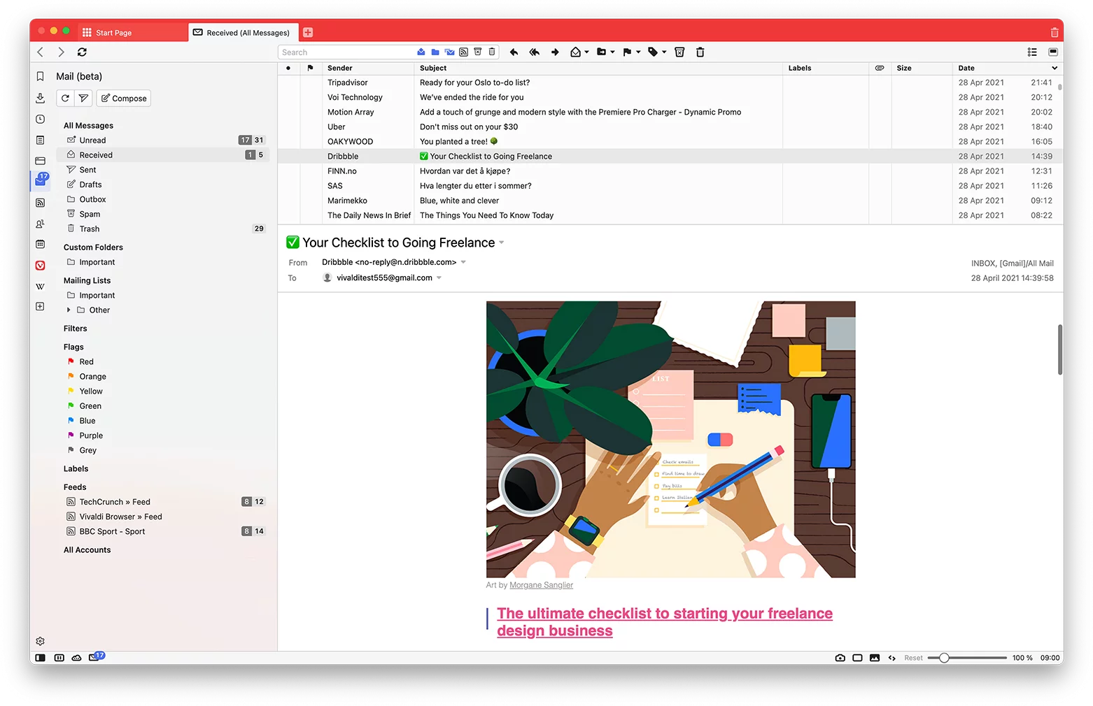 Vivaldi 4.0 propose également de nouveaux outils, dont les premières versions bêta de Vivaldi Mail, Calendar et Feed Reader. La nouvelle fonction Vivaldi Mail Beta intégrée au navigateur fonctionne localement sur votre ordinateur, comme Outlook ou Thunderbird. Elle comprend des fonctionnalités telles que la prise en charge de l’ajout de plusieurs comptes de messagerie, une interface utilisateur personnalisable avec prise en charge des onglets et une base de données qui vous permet de rechercher vos e-mails même lorsque vous êtes hors ligne (si les messages ont été téléchargés sur votre appareil).
