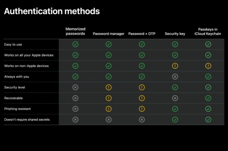 Voici comment Passkeys d’Apple dans iCloud Keychain se compare aux méthodes d’authentification existantes :