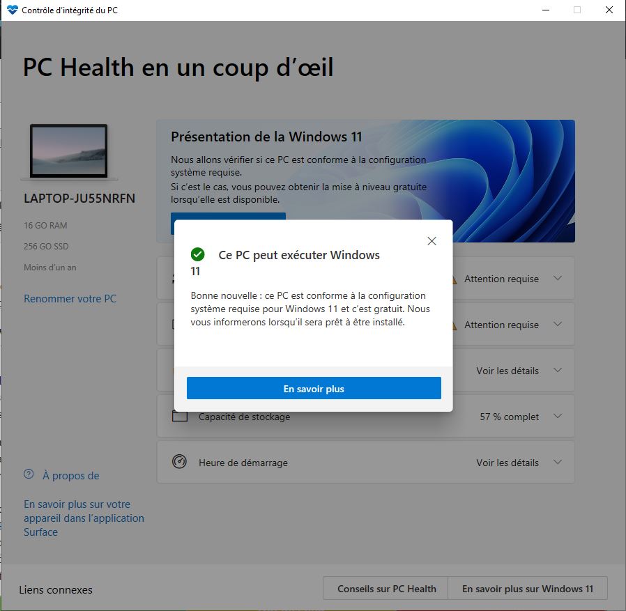 - En quelques secondes, l’application « Health Check » vous fera savoir si votre PC répond aux exigences du système pour exécuter Windows 11