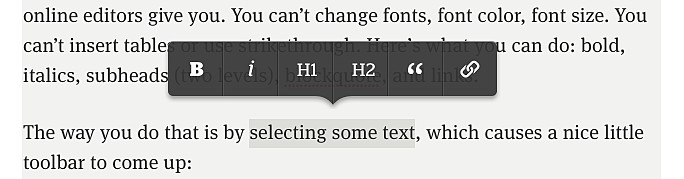 L’éditeur de Medium offre peu d’options à l’utilisateur, et cela semble être le cas. Simplicité ! Comme dans le formatage de vos articles, vous pouvez utiliser le gras, l’italique, insérer des titres H1, H3, des blocs de citation et des liens. Vous pouvez également ajouter des images. Et cela semble tout…
