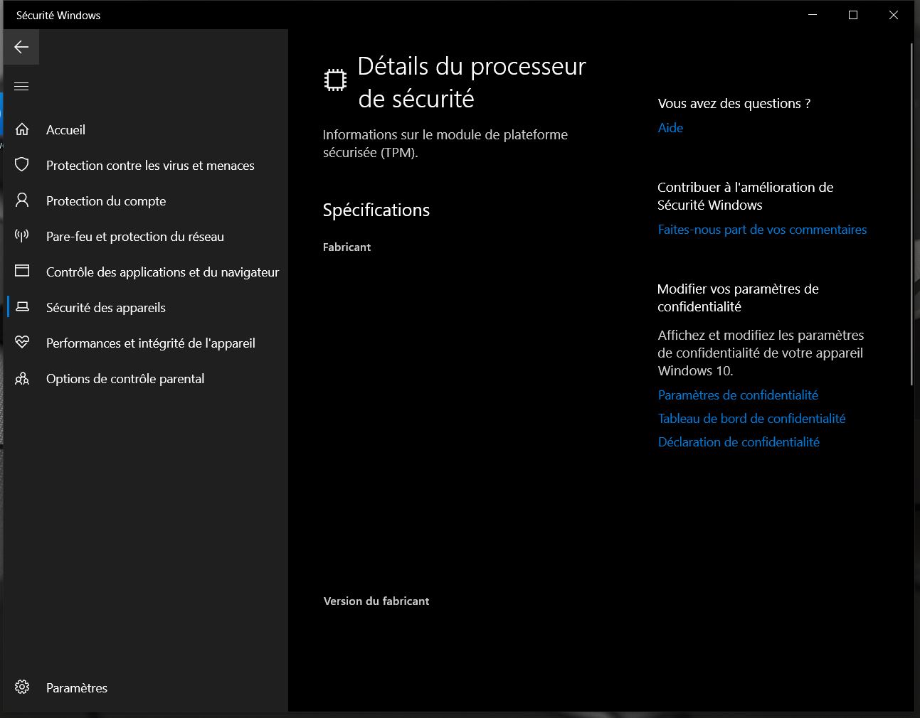 - Ici, cliquez sur les détails du « Processeur de sécurité », et vous trouverez toutes les informations concernant la puce TPM sur votre ordinateur