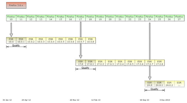 À ce jour, la dernière version de Firefox ESR était la version 10.0 ! Cette version 17.0 signale donc un nouveau cycle de développement :