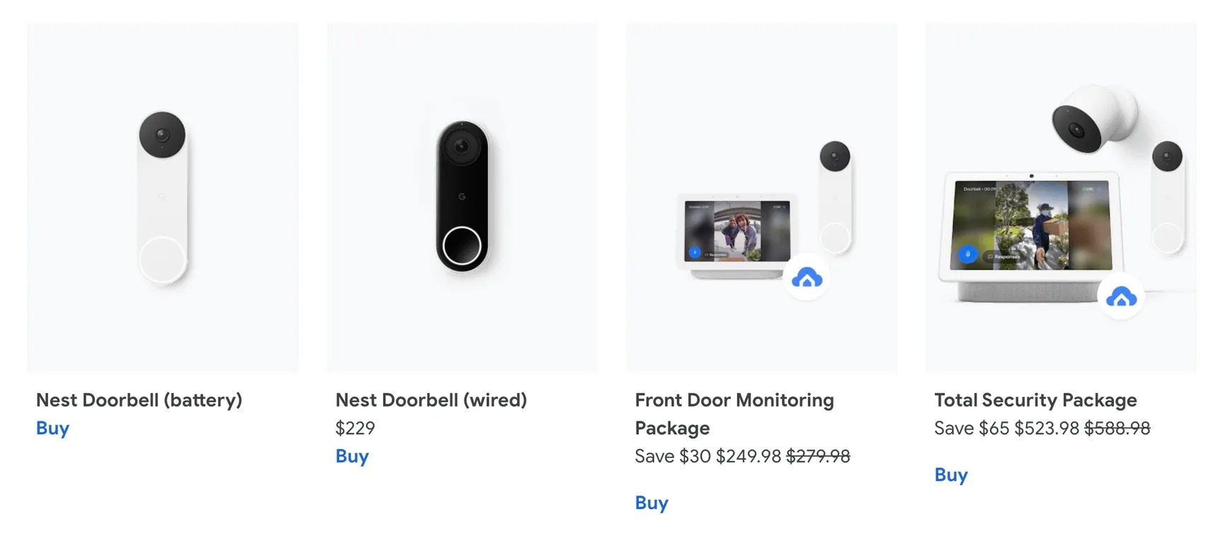 La fuite semblait montrer un total de quatre nouveaux modèles Nest, dont trois produits Nest Cam non annoncés et un nouveau modèle de sonnette Nest Doorbell. Les nouveaux produits figuraient dans le carrousel du site Google Store, ainsi que dans une nouvelle image d’en-tête qui a depuis été retirée.
