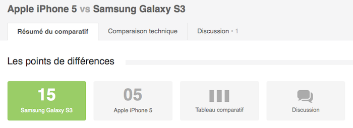 Ensuite, vous pouvez comparer des produits sous la forme d’un tableau en faisant clairement apparaître les différences ou encore d’afficher les résultats de ce comparatif de manière plus ludique. Les résultats apparaissent alors sous la forme d’un match avec un vainqueur. Le vainqueur sera le produit ayant remporté le plus de points, donc celui qui aura pris l’avantage sur certaines spécificités par rapport aux autres. Un exemple avec le match du moment, entre le Samsung Galaxy S3 et l’Apple iPhone 5.