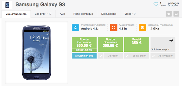 Enfin, sachez que vous pouvez aller sur les fiches produits (exemple Galaxy S3) qui regroupent tout un tas d’informations : une description avec une galerie de photos et vidéos, les tests, les avis et discussions, une fiche technique très détaillée et les meilleurs prix pour faire l’acquisition de ces produits.