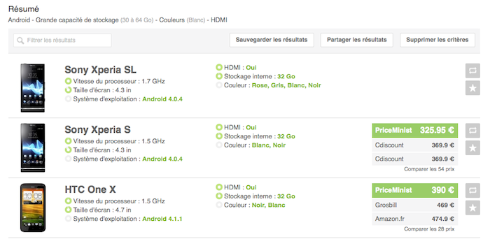 Ainsi, si vous souhaitez acheter un smartphone Android, blanc, avec une capacité de stockage supérieure à 30Go, et avec une prise HDMI : il suffit de cliquer sur ces critères et la liste de résultats s’affiche automatiquement ! Voici le lien de cet exemple.
