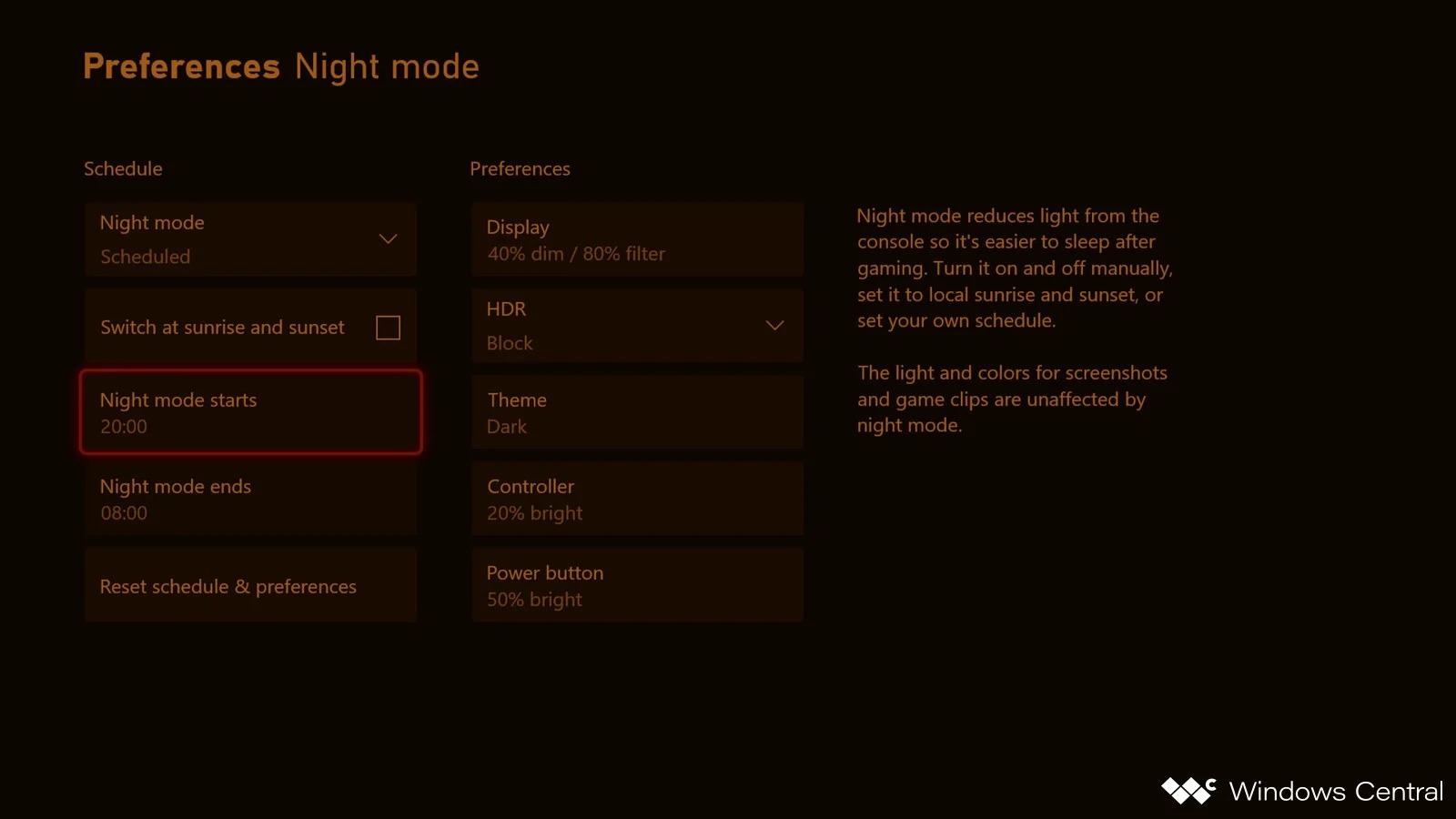 La nouvelle fonction Mode nuit est accessible en naviguant dans Paramètres -> Préférences -> Mode nuit. Ici, vous pouvez programmer le moment où le mode Nuit de la Xbox entre en vigueur. Si vous souhaitez que le filtre de lumière bleue se déclenche à 21 heures chaque soir, c’est possible.