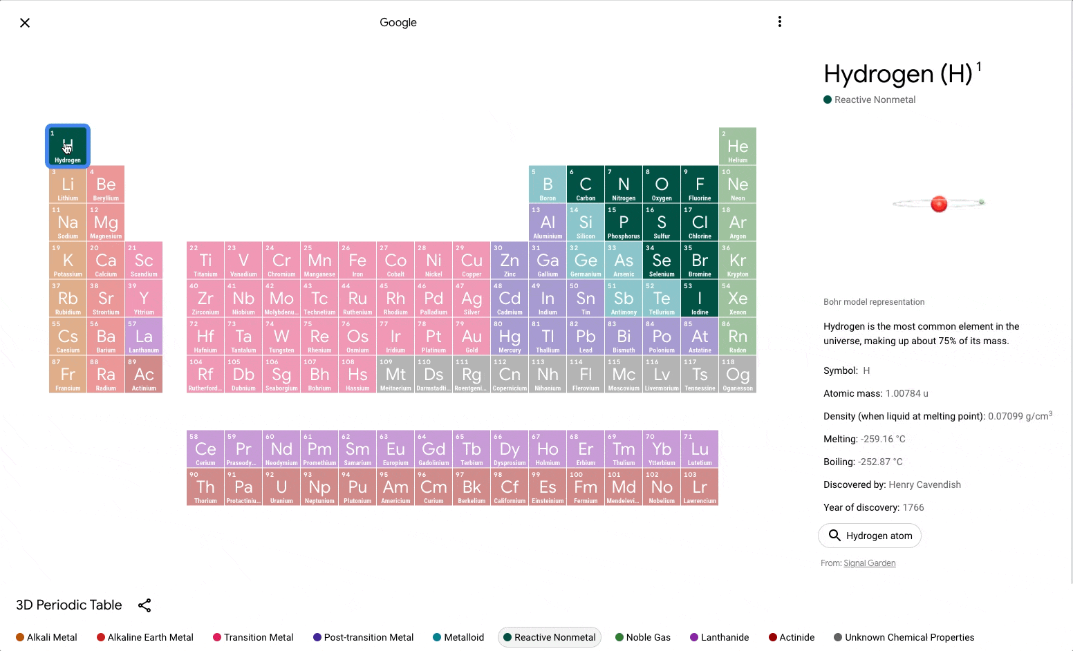 J’ai pris beaucoup de plaisir à cliquer sur les différents éléments et à en apprendre davantage sur des choses comme la masse atomique d’un élément, son point de fusion, et à voir un modèle 3D de chaque élément, ce que je trouve particulièrement cool. Chaque élément sur lequel j’ai cliqué est également accompagné d’une courte information.