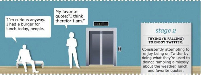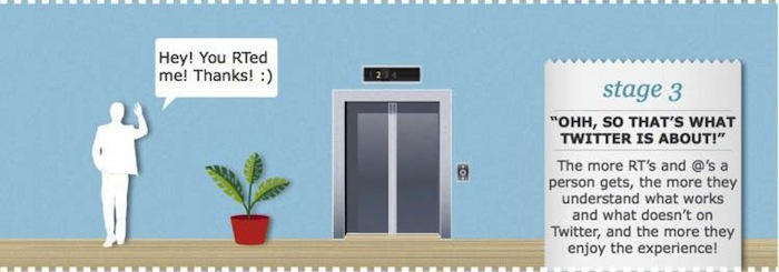 “Ohh, so that”s what Twitter is about !”, a un cycle de vie très faible. Une fois qu’un utilisateur comprend ce à quoi l’enfer à avoir avec les 140 caractères, la vie devient belle ! Il faut s’approprier l’expérience de Twitter, avec les mentions (@), les retweets (RT) et consorts…