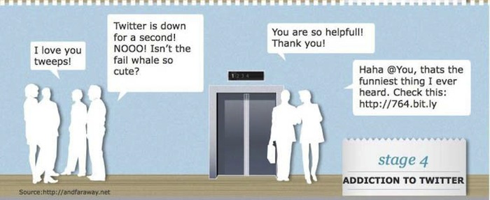 Enfin, la dernière étape est la phase de toxicomanie. Le toxicomane arrive sur Twitter pour un tas de choses et n’exclut rien : rencontrer des gens pour leurs botter le cul, créer son entreprise, améliorer des perspectives de carrière, lire des liens et des informations, rester au courant des news et des événements dans un délais très court, et obtenir de l’aide afin de prendre les bonnes décisions, ou encore faire des recherches ! Les
