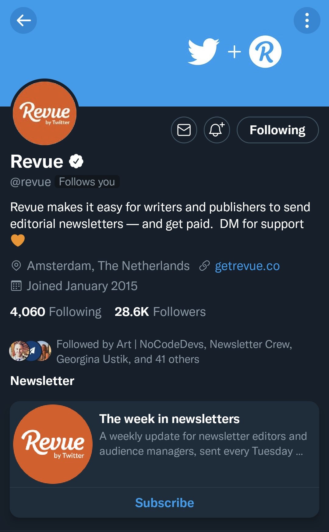 En effet, Twitter teste actuellement une fonctionnalité qui rendra encore plus attrayante l’utilisation de Revue : la possibilité de s’abonner à une newsletter directement à partir d’un profil Twitter, sans avoir à suivre un lien vers un site Web distinct. Cette fonctionnalité peut être activée par tous les rédacteurs de bulletins d’information Revue, mais le bouton n’est initialement présenté qu’à un groupe test d’utilisateurs de Twitter sur Android et sur le Web.