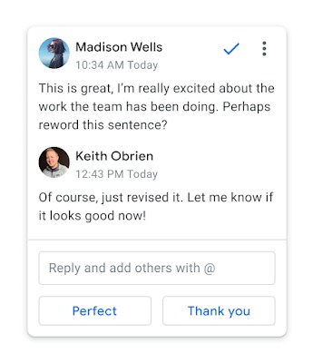 Cette fonctionnalité, qui devrait être disponible en septembre pour les utilisateurs du canal de publication « Lancement rapide » dans Google Workspace, affichera des suggestions de réponses aux commentaires laissés dans les documents, ce qui, selon Google, vous permettra de rédiger des commentaires et de les envoyer à vos collègues avec une « confiance accrue ».