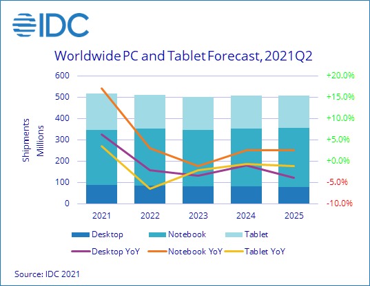 IDC prévoit que les livraisons d’appareils informatiques personnels augmenteront de 14,2 % pour atteindre 347 millions d’unités en 2021. Ce chiffre est en baisse par rapport à sa précédente prédiction de mai, qui prévoyait une croissance de 18 %. Les contraintes d’approvisionnement sont la principale raison de cette baisse. IDC a également prévu une croissance du marché des tablettes, mais à un rythme beaucoup plus lent de 3,4 %.