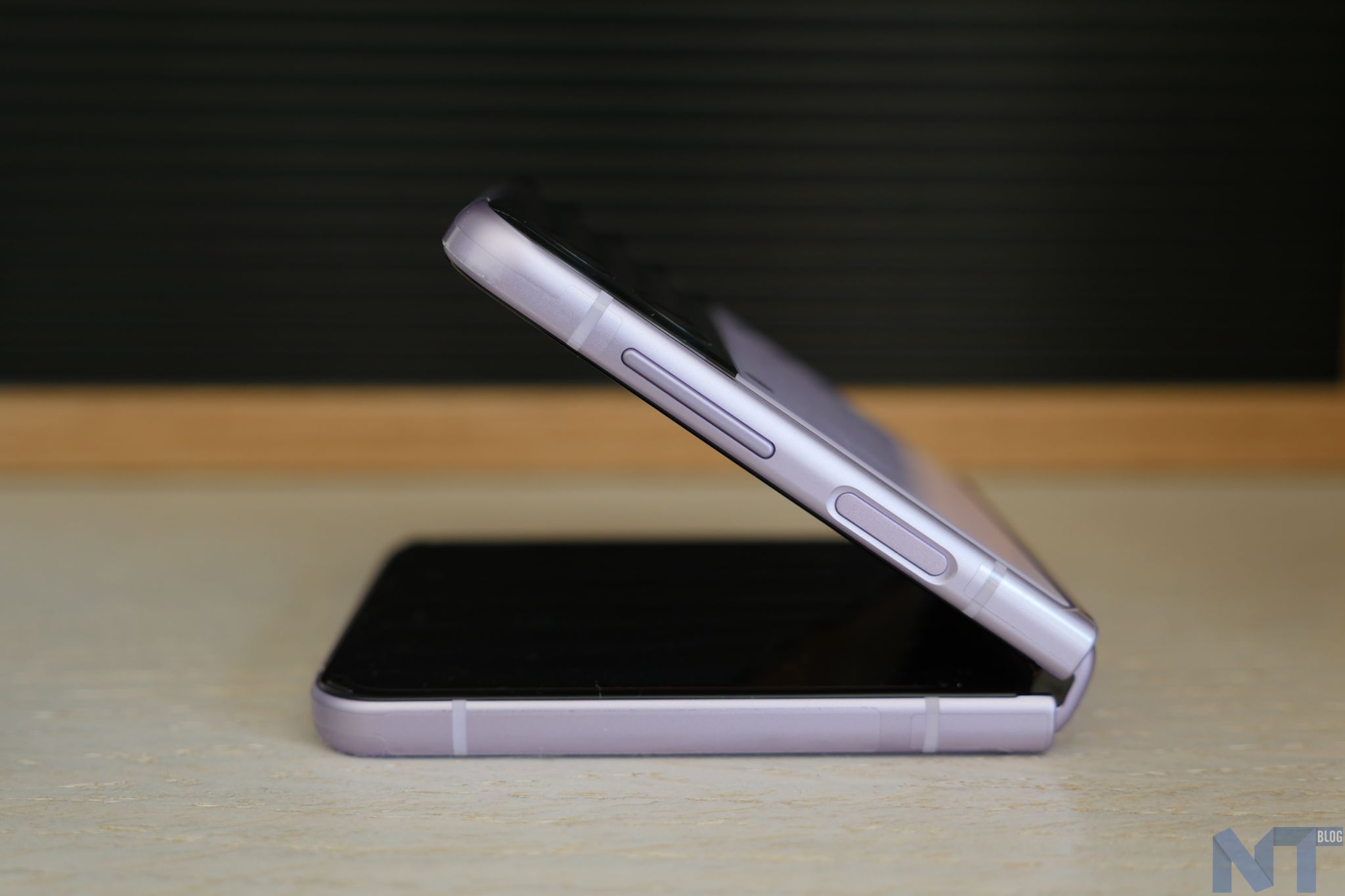 À part l’écran extérieur agrandi, le smartphone est configuré comme son prédécesseur. Sur le côté droit, on trouve un bouton de verrouillage avec un capteur d’empreintes digitales et un bouton de volume au-dessus, qui sont certes un peu hauts pour le confort lorsque le smartphone est déplié — le premier est tout juste atteignable avec le pouce (pour déverrouiller le téléphone), mais augmenter ou baisser le volume est presque impossible à faire d’une seule main.