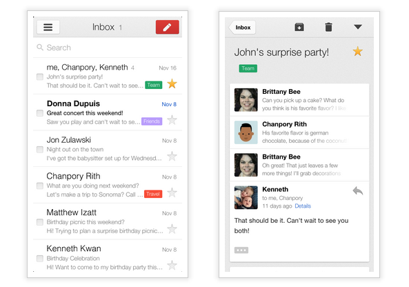 Outre le nouveau look, l’équipe Gmail a ajouté un certain nombre de nouvelles fonctionnalités à l’application qui facilitent son utilisation. D’une part, les e-mails affichent désormais la photo de profil du contact, si ce dernier l’a renseigné au sein de Google+. L’identité de chaque personne participant à une conversation du groupe va maintenant se visualiser immédiatement.