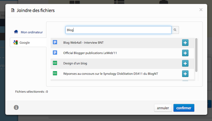 Dans la “barre de menu” nous allons disposer de deux boutons, “Messages” et “Tâches”, qui sont les éléments centraux de la plateforme. Le premier permet de créer et visualiser des messages, dédiés à un sujet, et pour lesquels vous pourrez y inclure des liens ou encore des fichiers. D’ailleurs, chose notable pour le partage de fichiers, Azendoo s’intègre avec Google Drive, le service de stockage de fichiers sur le cloud de Google, qui une fois connecté vous permet de directement sélectionner les documents stockés sur votre Drive pour les attacher à votre messager sur Azendoo. Vous allez ainsi pouvoir partager à vos collaborateurs des documents, dont les modifications en temps-réel seront automatiquement visibles par l’équipe, et dont celle-ci pourra commenter sur votre espace de collaboration pour ajuster tel ou tel paragraphe.
