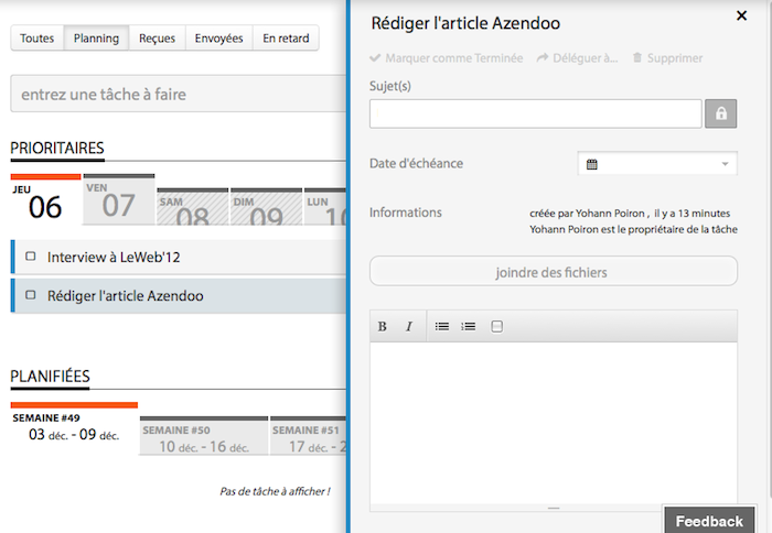 Voilà pour la partie “sociale” de la plateforme. L’autre volet, tout aussi important, est la gestion des tâches. De là, vous allez pouvoir créer des tâches liées à votre projet. Une fois créée, vous allez pouvoir déléguer une tâche à un membre de votre projet, l’affecter à un sujet, lui fournir une date d’échéance, joindre des fichiers, et bien sûr un champ texte qui vous permet de mettre des commentaires sur celle-ci. Petit point notable, un bouton “case à cocher” apparaît dans l’interface permettant de rajouter des sous-tâches à celle-ci ! En effet, on ne peut pas définir une hiérarchie de tâches au sein d’Azendoo.
