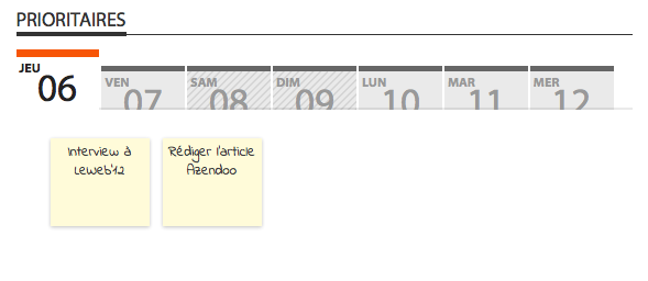 Une fois éditée, ma tâche va être accessible depuis soit une vue “liste”, soit une vue “post-it” dans lesquels il va être possible de faire du glisser-déposer au sein des différents regroupements : à la journée pour des tâches prioritaires, et à la semaine pour des tâches planifiées, ou encore “à organiser” dans tous les autres cas.