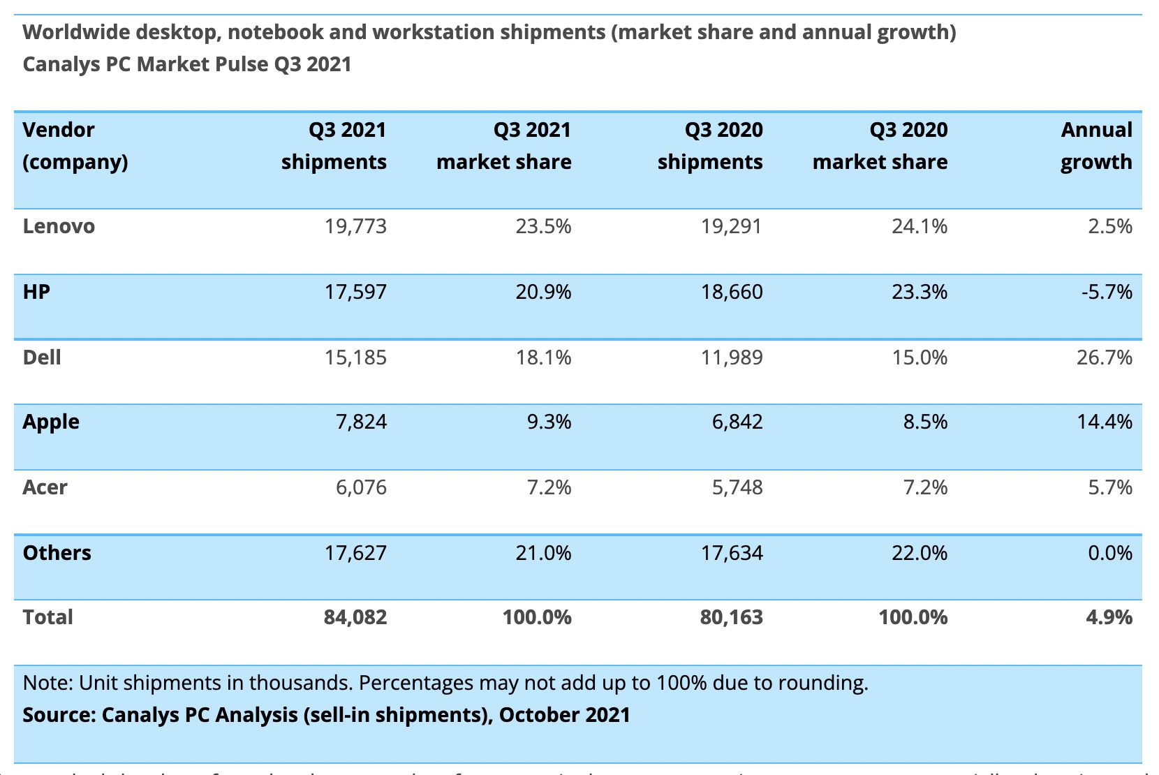 Si le marché des PC a connu une légère croissance en général, tous ne sont pas gagnants. Les 5 premiers fournisseurs restent pratiquement à la même place que l’année dernière, mais le leader du marché, Lenovo, a en fait connu une légère baisse de sa part de marché. Dell est l’exception surprenante avec une croissance de 26,7 % d’une année sur l’autre.