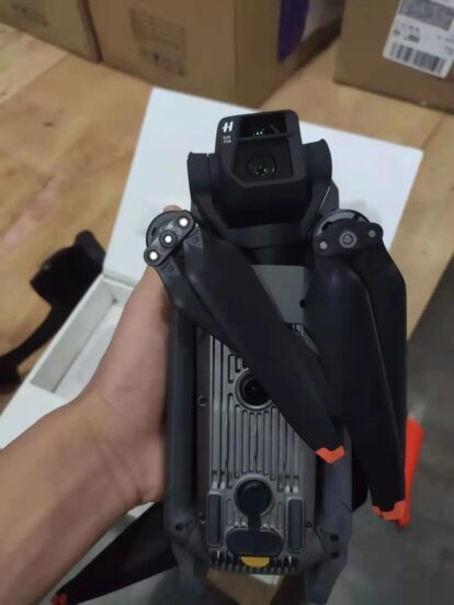 Les premières images du Mavic 3 que nous avons vu, recueillies par DroneDJ, proviennent apparemment d’un entrepôt chinois, et montrent le nouveau drone avec ses bras à la fois pliés et dépliés. Nous pouvons également voir de près son double module de caméra, qui, selon la rumeur, comprend un capteur quatre tiers de 20 mégapixels et un téléobjectif de 12 mégapixels avec un zoom optique équivalent à 7x.