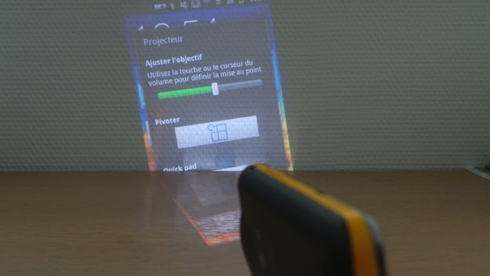 Le processeur NovaThor permet à Android d’être fluide, et de s’exécuter sans pépin ! La seule partie importante ici est l’application “Projecteur”, laquelle je vais décrire par la suite. Concernant l’exécution d’applications, de jeux, ou encore de YouTube qui prend tout son intérêt avec le picoprojecteur, ce ensemble fonctionne très bien sur l’écran de 4 pouces, et s’avère encore plus intéressant une fois projeté sur mon mur.