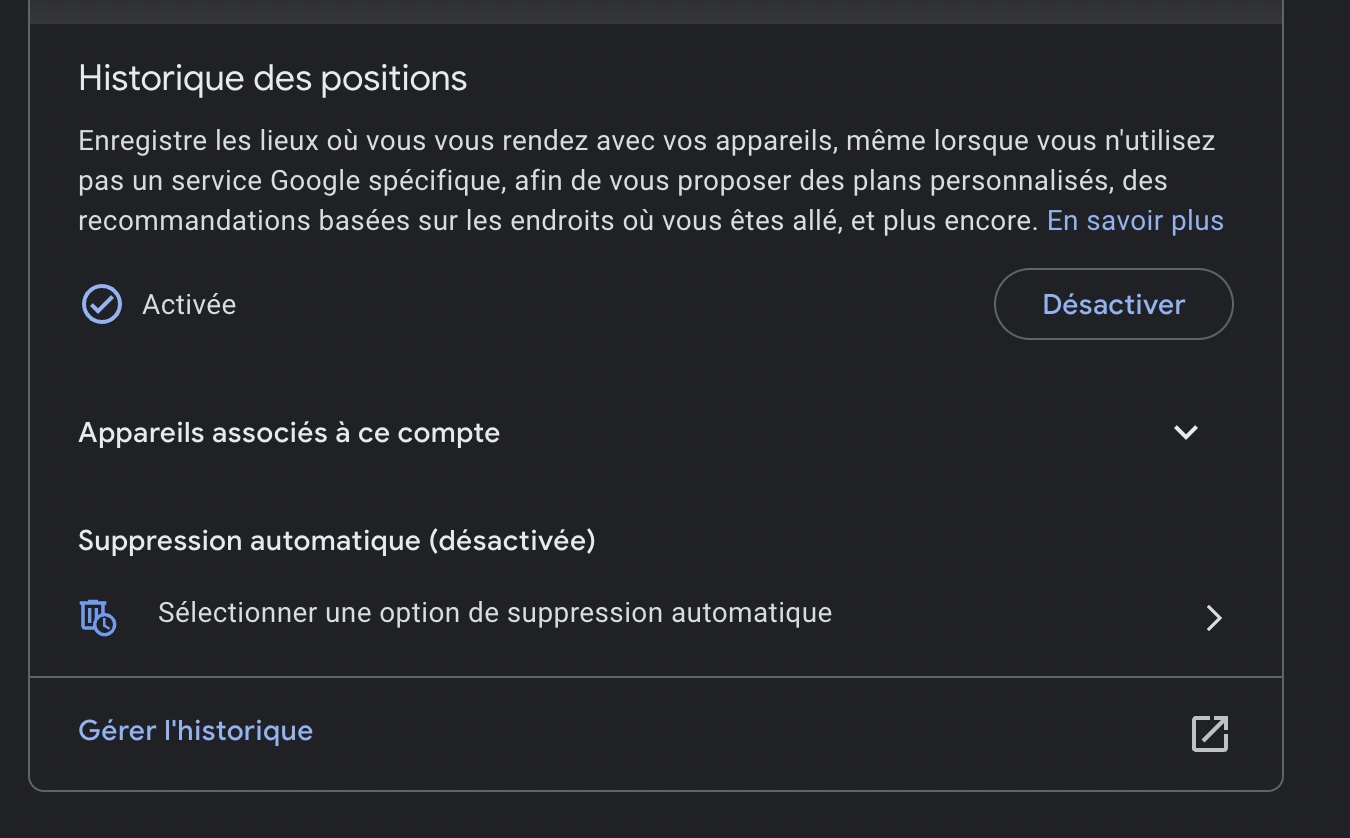 - Vous accédez alors à « Historique des positions », où l’une des options est « Gérer l’historique »