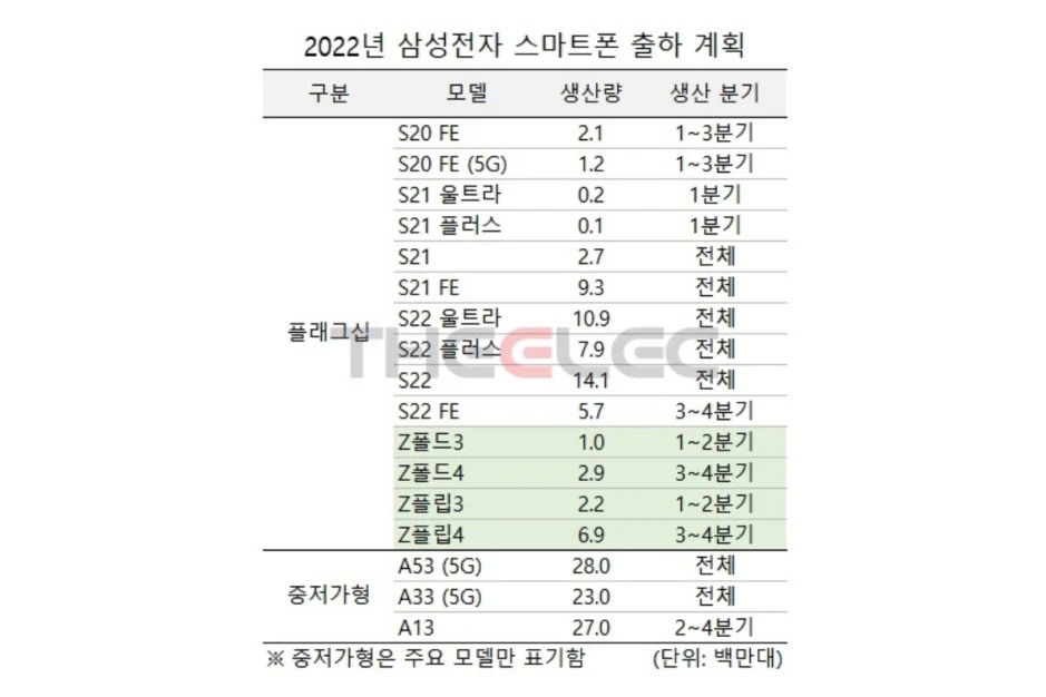 Enfin, c’est peut-être le moment d’acheter le S21+ ou le S21 Ultra (si vous pouvez encore les trouver quelque part), car leur production combinée pour 2022 devrait se situer à un niveau microscopique de 300 000 unités, contre 2,7 millions pour le S21 « standard » et 3,3 millions pour le S20 FE (en variantes 4G LTE et 5G).