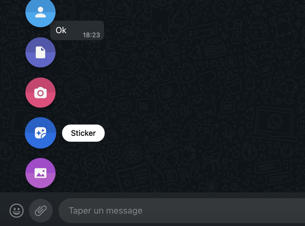 - Appuyez sur l’icône « Pièce jointe » dans le coin inférieur gauche de la boîte de message. Ensuite, sélectionnez l’option « Sticker »