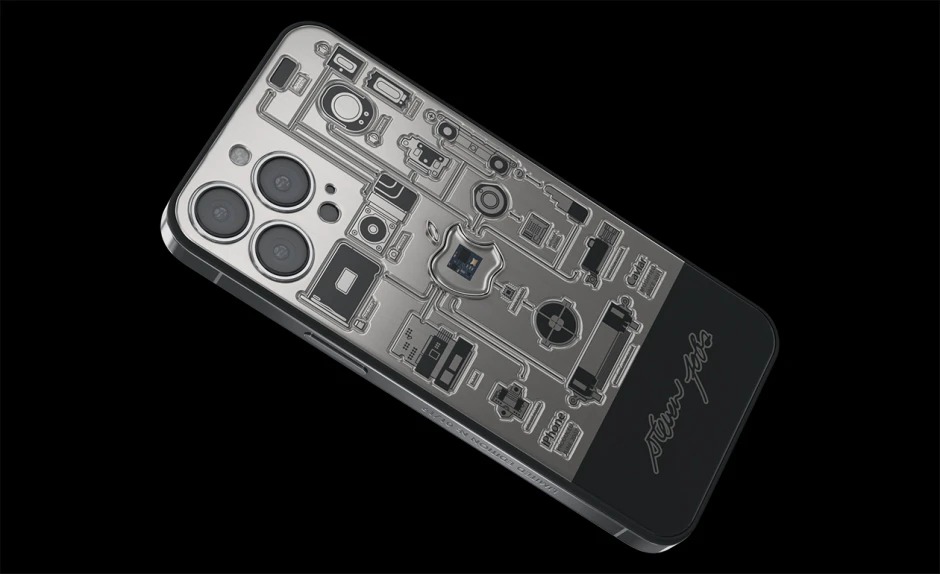 Le châssis lui-même a été fabriqué en titane de qualité aéronautique et est décoré d’un dessin des composants internes du téléphone. Le dessin est gravé au laser dans le boîtier. Selon Caviar, la décoration avait pour but de montrer la connexion des principaux éléments de l’appareil avec la carte mère qui se trouve dans le logo Apple.