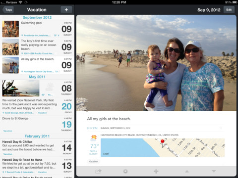 Vous pouvez écrire très rapidement des minis articles, tout en y apportant de nombreuses ressources ! Vous pouvez également définir un mot de passe pour l’application, de sorte que vous pouvez librement prêter votre iPad à vos amis sans vous soucier de divulguer vos secrets ! Day One est proposé à 4,49 € mais franchement vous ne serez pas déçu !