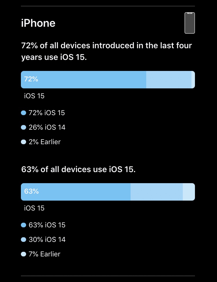 Près des trois quarts de tous les modèles d’iPhone introduits au cours des quatre dernières années ont été mis à niveau vers iOS 15, selon les données fournies par Apple sur l’une de ses pages d’assistance destinées aux développeurs.