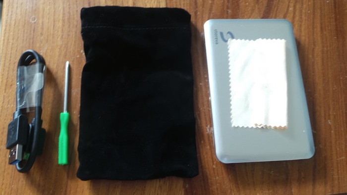 Du côté des accessoires fournis, outre le fait de retrouver le Xslim, et son câble USB nous également disposer d’une housse en velours afin de transporter notre disque, et d’un chiffon de quoi permettre le nettoyage de la coque arrière pour qu’elle continue de briller !
