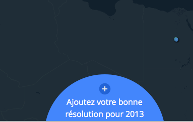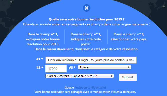 En effet, depuis sa page Zeitgeist, qui regroupe les faits marquants de l’année 2012, Google a cette année innové en apportant une nouvelle fonctionnalité “Quelle sera votre bonne résolution pour 2013 ?”, accessible depuis ce lien. Comme vous allez le voir en cliquant sur ce dernier, une animation sera accessible en bas de la page faisant apparaître un demi cercle bleu dans lequel vous pourrez dire au monde entier, en renseignant quelques champs dans votre langue maternelle, quelle sera votre bonne résolution pour 2013.