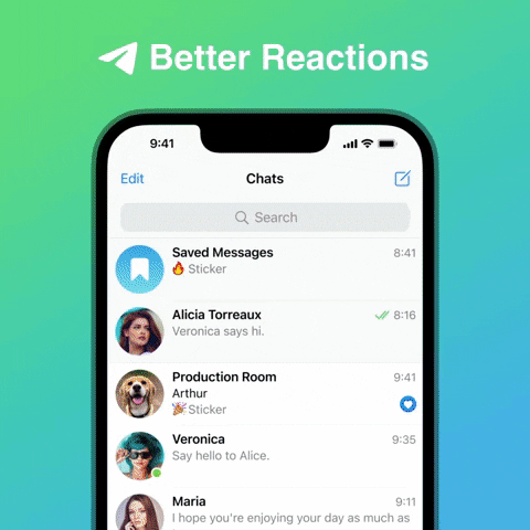 Outre la prise en charge des autocollants vidéo, Telegram a également ajouté cinq nouveaux emojis de réaction afin que les utilisateurs puissent réagir de manière pertinente aux messages. En outre, ces réactions sont interactives par nature, ce qui signifie que si un utilisateur touche et maintient un emoji de réaction avant de l’envoyer, la réaction se transformera en un effet synchronisé en plein écran.