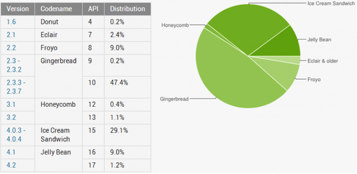 Plus précisément, 10,2% des utilisateurs d’Android sont maintenant sur Jelly Bean, 29,1% utilisent ICS, 1,5% Honeycomb, 47,6% sont encore au contact de Gingerbread, et 9% sont encore tragiquement sur Froyo. Voici à quoi ça ressemble dans le graphique et sous forme de tableau :