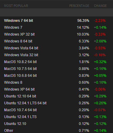 Peut-être l’avez-vous constaté, l’accumulation des pertes de parts de marché des anciennes versions de Windows ne correspond pas au gain de Windows 8. C’est vrai, et la raison est simple : OS X. En effet, en apportant le support de Steam sur l’OS d’Apple, de nombreux joueurs ont sauté sur l’occasion, permettant à OS X d’être en hausse de 0,46%. Cependant, la plus grande nouvelle pour les outsiders, c’est l’arrivée d’Ubuntu sur la scène des jeux-vidéos !