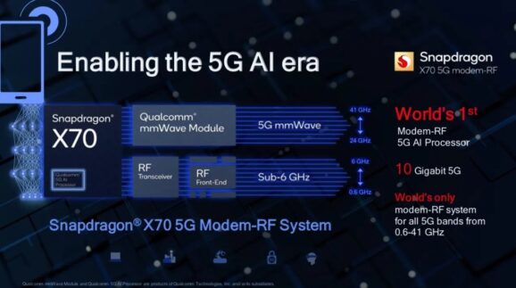 Avec le plus grand événement mobile de l’année, le MWC 2022, en cours à Barcelone, nous avons déjà vu de nouveaux lancements de Samsung, Realme, et bien d’autres. Et maintenant, l’un des plus grands fabricants de puces mobiles Qualcomm a dévoilé son dernier modem Snapdragon X70 5G lors du salon. Ce modem prend en charge les fréquences sub-6GHz et mmWave, est le premier modem au monde à inclure un processeur AI 5G, et des vitesses de téléchargement 5G pouvant atteindre 10 Gb/s.