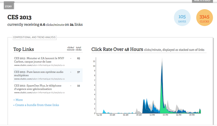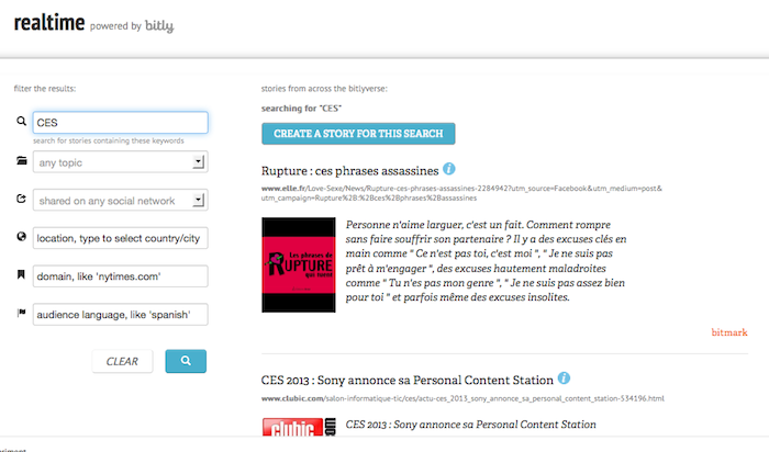 Le premier plus de l’API, concerne la recherche en temps réel. Pour tester ceci, les utilisateurs peuvent aller à rt.ly et s’authentifier en utilisant leur connexion Bitly – vous devez avoir plus de 18 ans. Une fois là, n’importe qui peut exécuter une requête pour récupérer les premières URL et les résultats – stories – pour cette recherche. Il suffit de choisir une phrase précise comme “CES” ou spécifier un critère de filtrage.