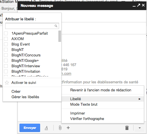 Concernant l’ajout d’hier, celui-ci va vous permettre d’ajouter des libellés aux messages sortants depuis le menu des “autres options” – flèche vers le bas à droite de la boîte de dialogue. Une fois cliqué, allez sur libellé, et de là attribuez le libellé que vous souhaitez à votre mail d’envoi.