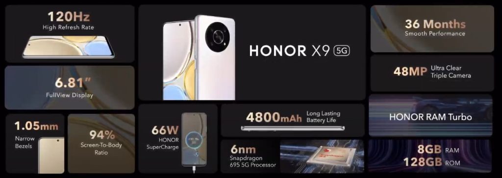 Le nouveau Honor X9 5G pèse 189 grammes, et ses dimensions sont de 166,07 x 75,78 x 8,05 mm. Il prend en charge la double carte SIM, et dispose d’un capteur d’empreintes digitales capacitif incrusté sur le côté. L’écran est un grand écran Honor FullView de 6,81 pouces, et il prend en charge un taux de rafraîchissement de 120 Hz et un taux d’échantillonnage tactile de 240 Hz. Il a une résolution de 2 388 x 1 080 pixels. Il y a également une découpe perforée sur le dessus qui contient une caméra frontale de 16 mégapixels avec une ouverture de f/2,45.