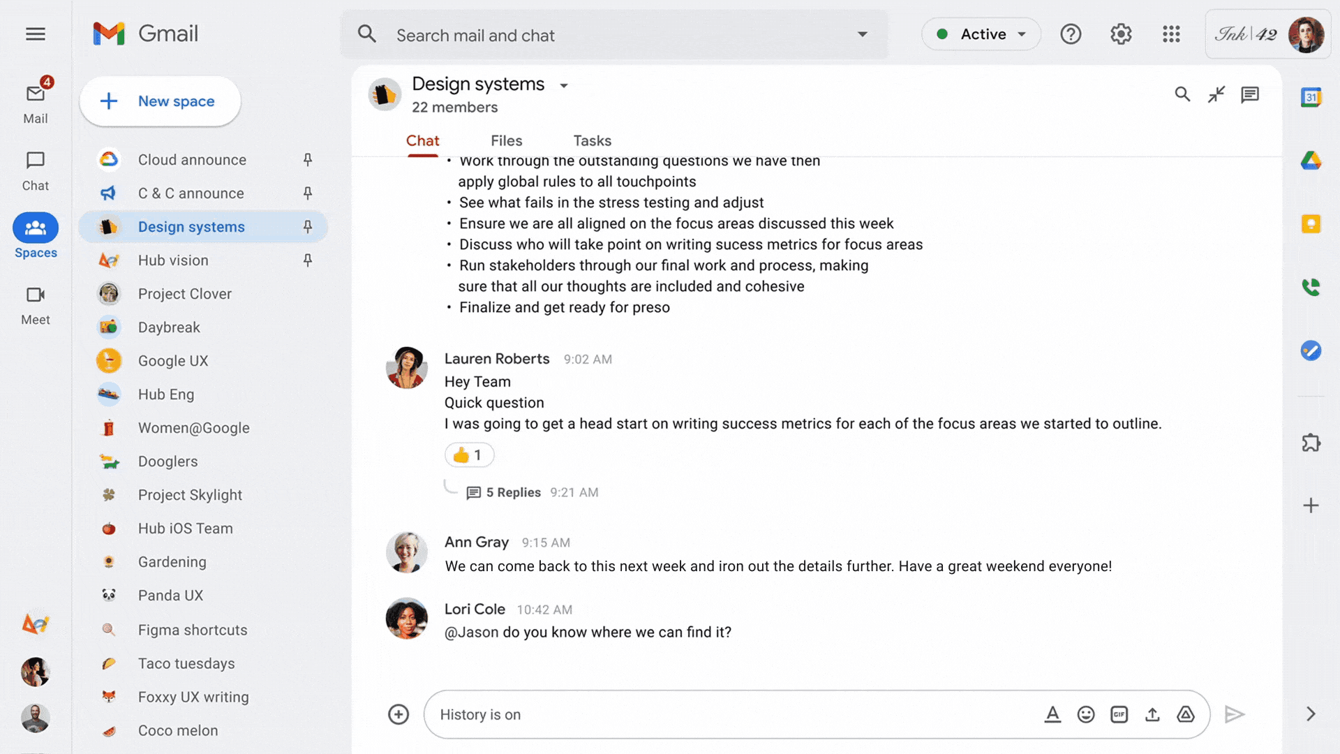 Et pour maintenir l’intérêt des utilisateurs de livestream, Google ajoutera également de nouvelles fonctionnalités, comme les questions-réponses et les sondages. La société prend soin de noter que, même si une grande partie de la collaboration significative se fera en temps réel, il existe également des situations où les connexions asynchrones peuvent être tout aussi importantes. Elle a apporté des mises à jour à son portail Spaces avec des fils de discussion en ligne.