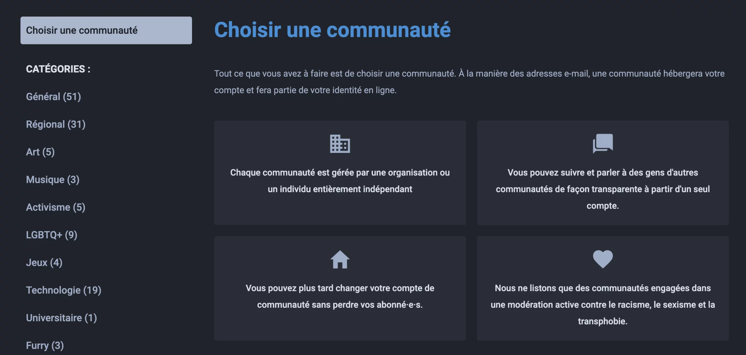 L’autre classification des serveurs Mastodon est liée à leur type de contenu, c’est-à-dire que l’on trouve un certain nombre de serveurs thématiques : général, régional, art, musique, activisme, LGBTQ+, jeux vidéo, technologie, universitaire, furry et nourriture.