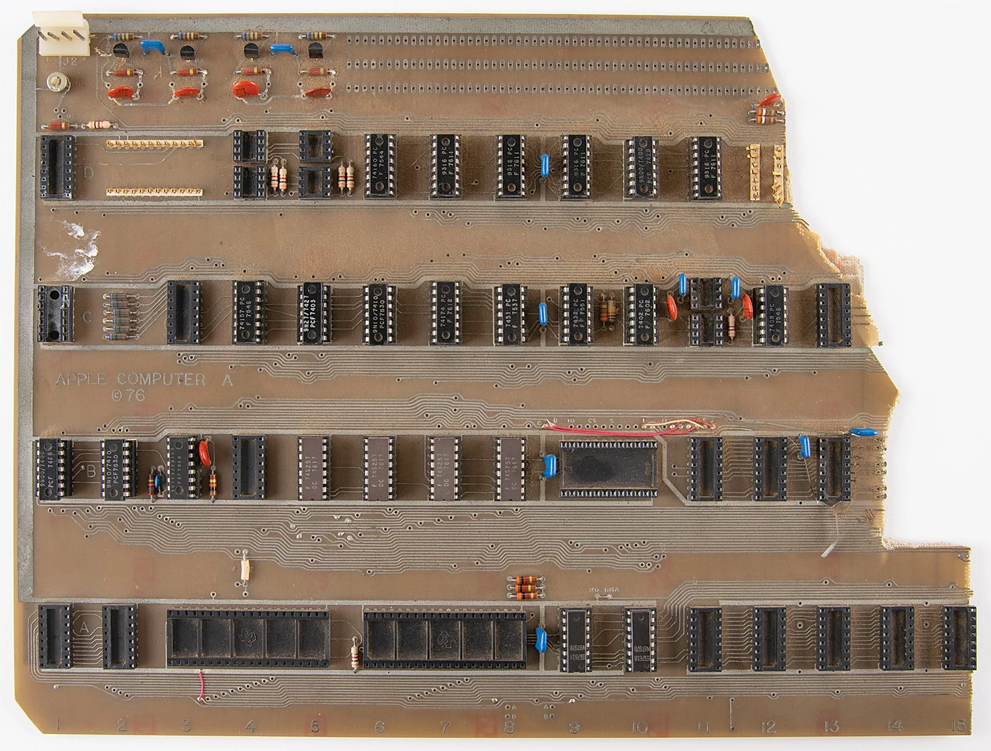 L’authenticité du circuit imprimé mis aux enchères a été vérifiée sur la base de photographies prises par Terrel en 1976. La description de RR aborde également les différences entre cette carte prototype et les variantes de production. La carte, par exemple, semble avoir été soudée à la main par Steve Wozniak, qui avait une technique atypique « à trois mains », utilisant sa bouche en plus de ses deux mains. Wozniak a également effectué plusieurs connexions point à point à l’arrière du circuit imprimé — un travail de réparation rapide pour le rendre entièrement fonctionnel juste à temps pour la démonstration.