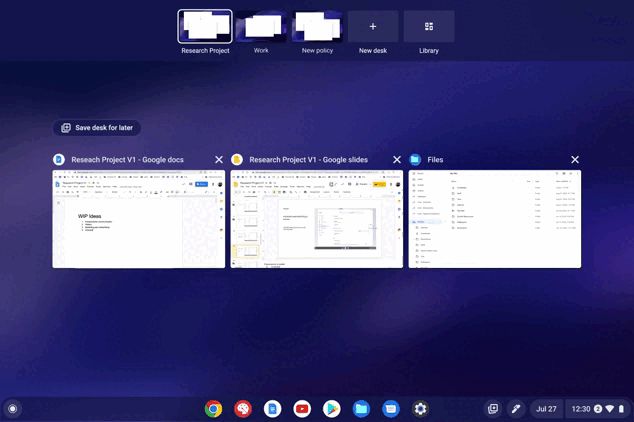 En ce qui concerne les modifications apportées aux bureaux virtuels, Google indique que vous serez bientôt en mesure de fermer et d’enregistrer des bureaux virtuels comme bon vous semble. Cela vous permettra de mieux vous concentrer et de revenir à un ensemble spécifique de fenêtres ou d’applications groupées que vous avez ouvertes sur votre Chromebook d’un simple toucher. Google prévoit une sortie fin septembre pour cette fonctionnalité.