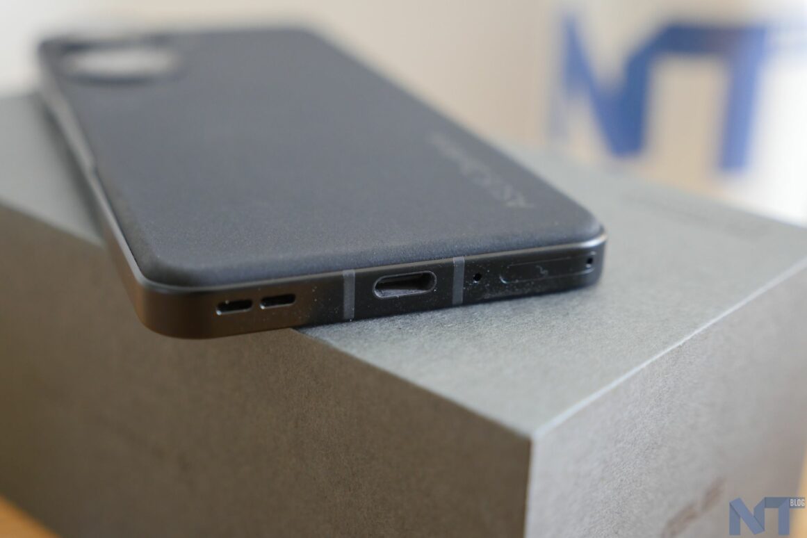 Le côté gauche du châssis est complètement propre, on peut trouver la prise audio de 3,5 mm sur le dessus, il y a un port USB-C sur le bas à côté de la grille du haut-parleur, le micro et le plateau SIM. Et sur la droite se trouve le bouton d’alimentation intelligent/capteur d’empreintes digitales, sous les boutons de volume.
