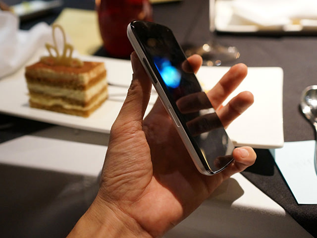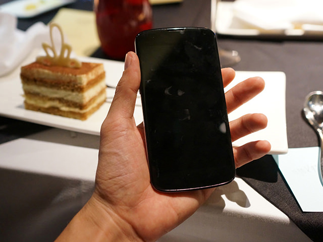 Comme je l’avais mentionné lors du test produit du Nexus 4 “Noir” donc, l’un des éléments de conception que j’ai préféré sur le Nexus 4 est le reflet sur la façade arrière qui est également le procédé breveté et disponible sur le LG Optimus G. Pour ce faire, LG glisse un pattern sous le panneau de verre qui réagit à la lumière, ce qui permet de modifier les motifs du pattern suivant différents angles. On peut clairement le comparer à une robe de soirée ! Et bien tout porte à croire que LG et Google ont voulu garder la même ligne de conduite et on retrouve donc cet effet pailleté, qui semble plus marqué encore que sur le Nexus 4 actuel.