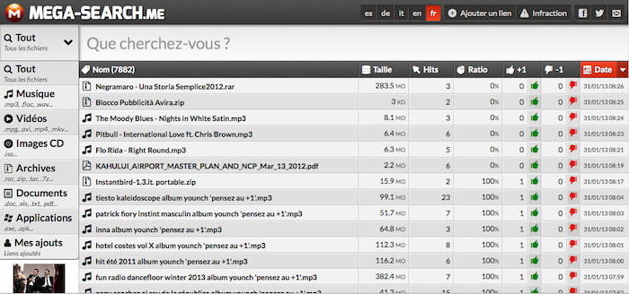 Une boîte de recherche en haut vous permet tout naturellement de rechercher des fichiers sur la plateforme, et un menu déroulant sur le côté vous permet de filtrer les résultats – vidéo, musique, etc… Les utilisateurs peuvent voter en dessous de chaque fichier, et le nombre de visites apparaît dans une colonne à droite du nom du fichier.