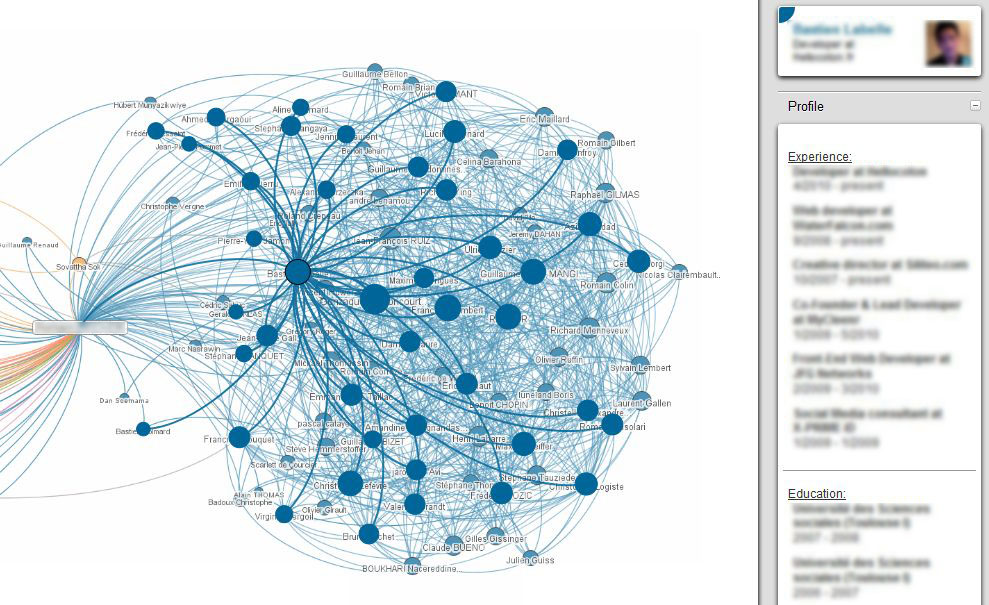 En plus de la cartographie de vos contacts, il les sépare aussi dans différentes couleurs. Les couleurs sont censées représenter en quelque sorte des groupes de personnes connectées, par exemple les personnes avec qui vous avez travaillé, une entreprise en particulier, ou des personnes que vous avez rencontré lors de conférences.