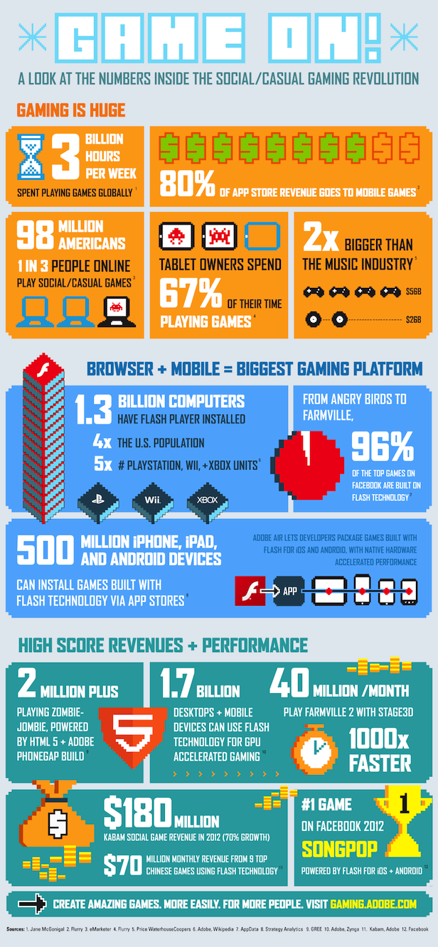 Une nouvelle infographie partagée par Adobe montre combien d’argent un développeur est susceptible de se faire avec la création de jeux pour les plateformes mobiles. Combien ? Disons simplement que l’industrie du jeu mobile représente aujourd’hui deux fois plus que l’industrie de la musique. C’est 56 milliards de dollars qui sont injectés dans une seule industrie chaque année. Au-delà de l’argent, ceux qui recherchent à disposer d’une audience conséquente, peuvent miser sur le mobile – 98 millions d’Américains jouent à des jeux sur les réseaux sociaux ou occasionnellement sur le dispositif.